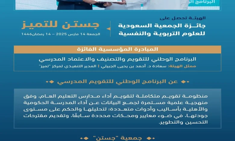 “البرنامج الوطني للتقويم والتصنيف والاعتماد المدرسي” يحصل على جائزة “جستن” للتميز في دورتها الرابعة