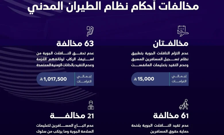 وأظهر التقرير إصدار مخالفتين بحق الناقلات الجوية؛ وذلك لعدم التزامها بتطبيق نظام تسجيل المسافرين المسبق وعدم التقيد بتعليمات المنافسة، بإجمالي غرامات بلغت قيمتها (15.000) ريال، و(63) مخالفة صادرة بحق الناقلات الجوية؛ وذلك لعدم قيامها بالتحقق من استيفاء الركاب لوثائقهم اللازمة، إضافة إلى عدم التقيد بالخانات الزمنية المعتمدة بإجمالي غرامات تجاوزت قيمتها مليون ريال.