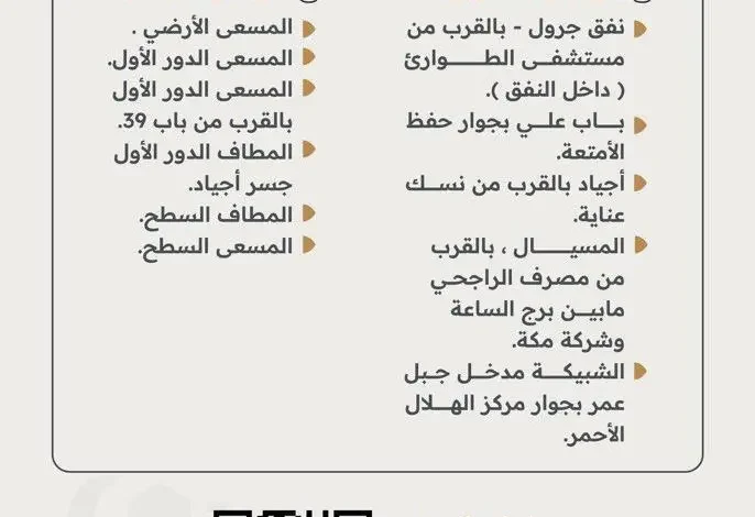 وأفادت أن الأماكن الخارجية تقع في نفق جرول بالقرب من مستشفى الطوارئ (داخل النفق) وباب علي بجوار حفظ الأمتعة, وموقع أجياد بالقرب من نسك عناية, وفي المسفلة بالقرب من المصرف, وموقع الشبيكة مدخل جبل عمر بجوار مركز الهلال الأحمر.