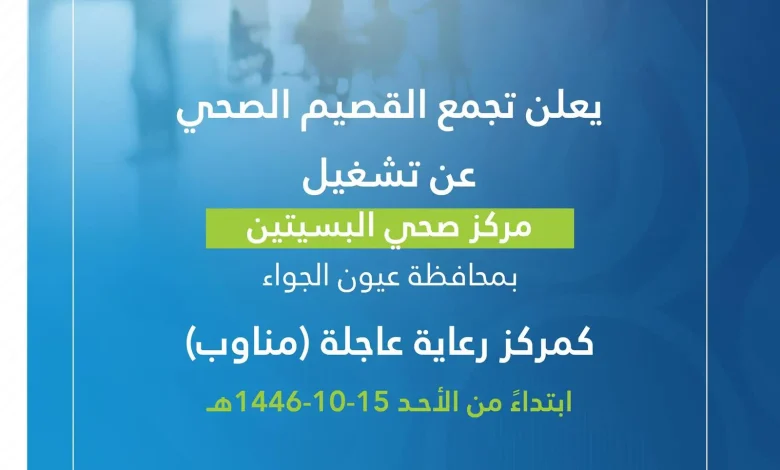 تجمع القصيم الصحي يُعلن تشغيل مركز البسيتين مركز رعاية عاجلة “مناوب”