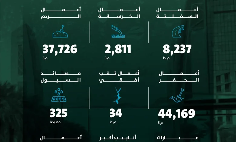 وشملت الأعمال حفر ما يزيد عن 44.169 ألف متر مكعب، وتنفيذ 34 مترًا طوليًا من أعمال الثقب الأفقي، إلى جانب تركيب أنابيب يزيد قطرها عن 300 مليمتر بطول بلغ 9.270 مترًا طوليًا, وتضمنت الجهود الميدانية صيانة 325 مصيدة للسيول، وتنفيذ 95 منهلًا، و 639 مترًا طوليًا من العبارات الصندوقية.