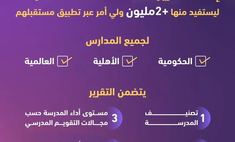 وتهدف مشاركة تقرير أداء المدرسة مع أولياء الأمور إلى تعزيز دور الأسرة في العملية التعليمية من خلال توفير معلومات دقيقة، وتسهل متابعة مستوى أداء مدارس أبنائهم ودعم تعلمهم والتحضير لمستقبلهم.
