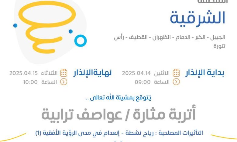 وكان المركز قد أصدر تنبيهًا متقدمًا في وقت سابق، حذر فيه من عواصف ترابية تؤدي إلى تدنٍ في مدى الرؤية الأفقية، شملت عددًا من مدن ومحافظات الشرقية، من بينها الدمام، الخبر، الظهران، الجبيل، القطيف، رأس تنورة، الخفجي، النعيرية، وقرية العليا.