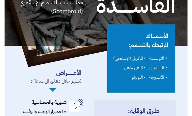 استعرضت الهيئة العامة للغذاء والدواء ضمن حملتها التوعوية، أبرز حالات التسمم الغذائي المرتبطة بالأسماك، مشددةً على أهمية التعامل السليم معها لحماية الصحة العامة، وذلك في ظل القيمة الغذائية العالية للأسماك واحتوائها على عناصر مهمة، منها الأحماض الدهنية (أوميغا 3)، التي تُعد جزءًا أساسيًا من النظام الغذائي الصحي.