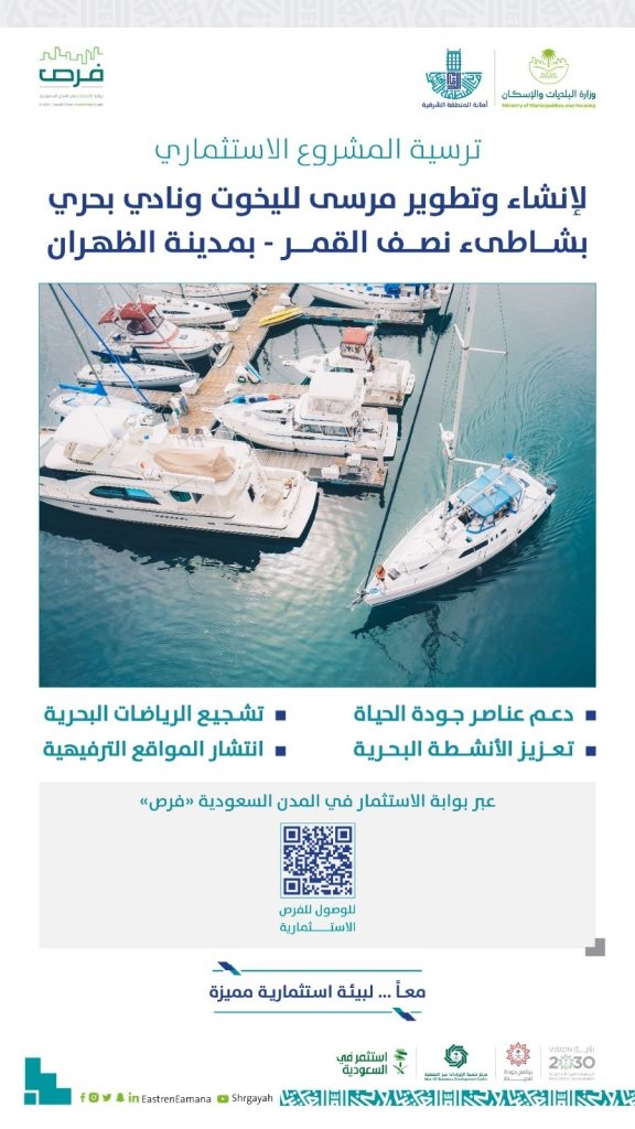 أمانة الشرقية ترسي مشروعًا استثماريًا لتطوير نادي بحري ومرسى في شاطئ نصف القمر