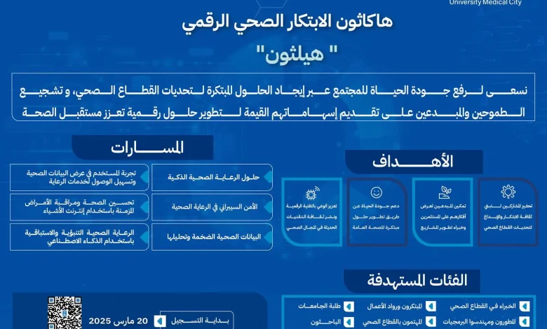 تنظّم المدينة الطبية بجامعة الملك سعود، هاكاثون الابتكار الصحي الرقمي الأول “هيلثون” في الـ 15 مايو 2025م، بهدف تعزيز الابتكار في القطاع الصحي والإسهام في رفع جودة الحياة.