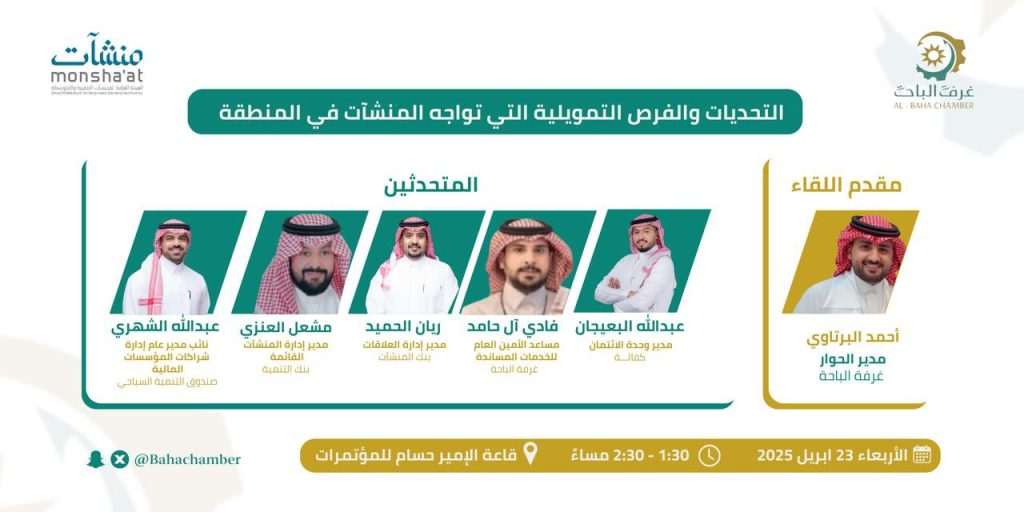 وتأتي هذه الفعالية ضمن جهود غرفة الباحة و”منشآت” لتمكين رواد الأعمال وأصحاب المنشآت الصغيرة والمتوسطة، من خلال توفير منصة تفاعلية تجمعهم مع الجهات التمويلية، الحكومية والخاصة، لبحث الفرص والخيارات المتاحة التي تسهم في نمو واستدامة أعمالهم.