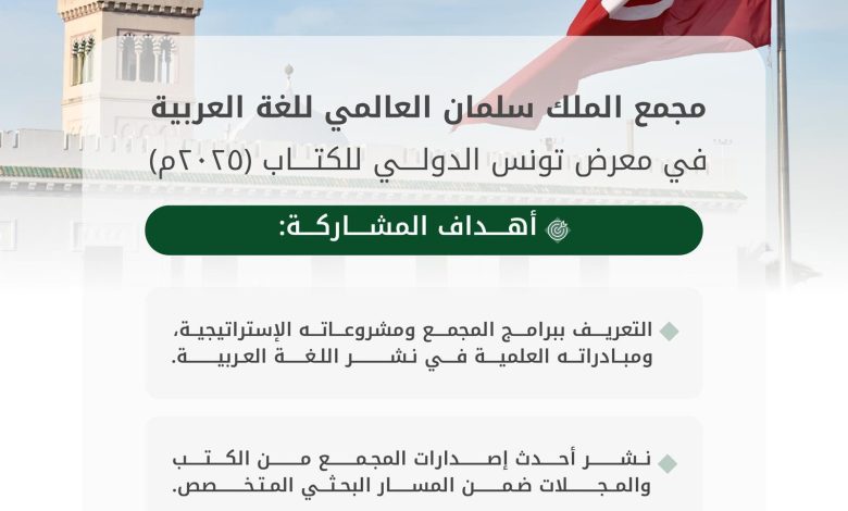 يُواصل مجمع الملك سلمان العالمي للغة العربية حضوره الفاعل في الفعاليات الثقافية العربية والدولية من خلال مشاركته في معرض تونس الدولي للكتاب 2025، الذي يُقام في المدة من 25 أبريل إلى 4 مايو المقبل، ضمن جناح الملحقية الثقافية في جمهورية تونس، بمشاركة مؤسسات ثقافية وعلمية سعودية بارزة.