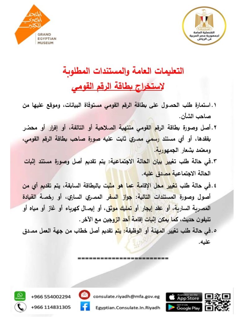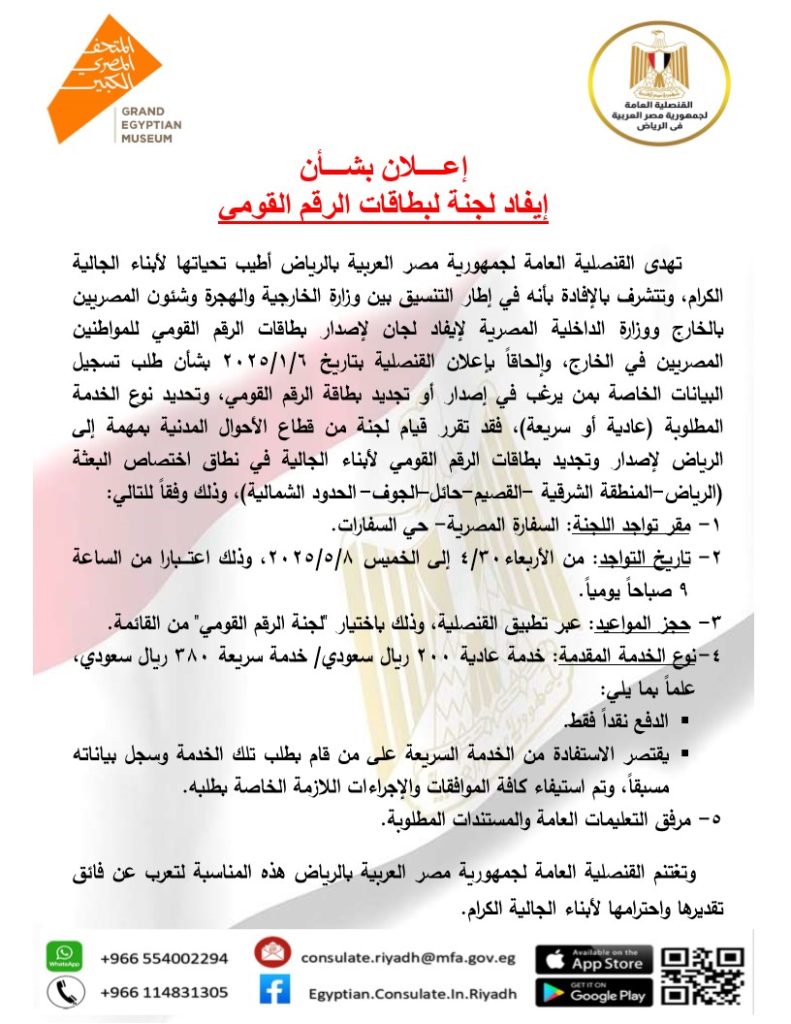 القنصلية المصرية بالرياض تستقبل المواطنين لإستخراج بطاقات الرقم القومي بعد غد الأربعاء 30 أبريل