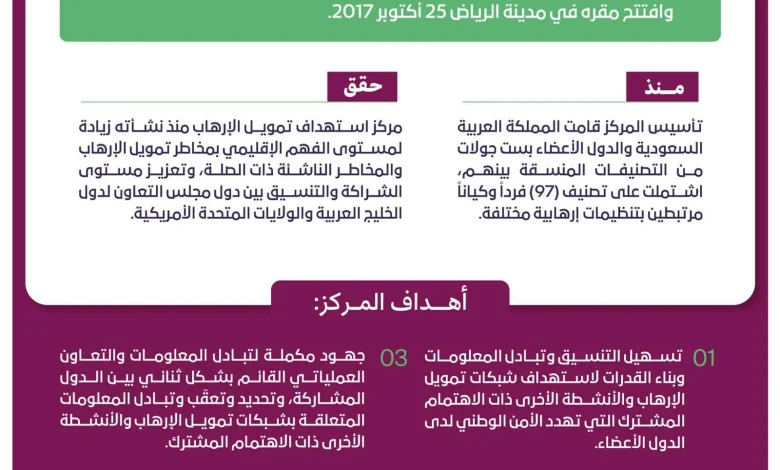 وأسهمت المملكة العربية السعودية بشكل حثيث في جهود المركز الذي دُشن مقره الرئيس في مدينة الرياض في 25 أكتوبر 2017م، حيث تأتي تلك الجهود مكمّلةً لتبادل المعلومات والتعاون العملياتي القائم بشكل ثنائي بين الدول المشاركة، وتحديد وتعقُّب وتبادل المعلومات المتعلقة بشبكات تمويل الإرهاب والأنشطة الأخرى ذات الاهتمام المشترك، بما فيها التهديدات ذات الصلة التي تصدر من المنظمات الإرهابية.