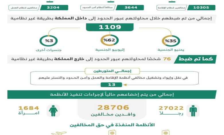ثانيًا: بلغ إجمالي من تم ضبطهم خلال محاولتهم عبور الحدود إلى داخل المملكة (1109) أشخاص (35%) منهم يمنيو الجنسية، و(62%) إثيوبيو الجنسية، و(03%) جنسيات أخرى، كما تم ضبط (76) شخصًا لمحاولتهم عبور الحدود إلى خارج المملكة بطريقة غير نظامية.