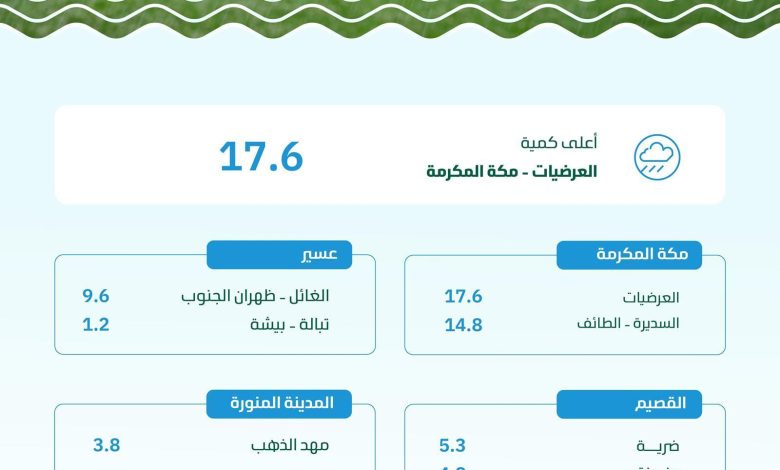سجّلت محطة رصد العرضيات بمنطقة مكة المكرمة، أعلى معدل لكميات هطول الأمطار في المملكة بـ (17.6) ملم، وذلك ضمن (6) مناطق شهدت كميات متفرقة من الأمطار، فيما سجّلت السديرة بالطائف (14.8) ملم.