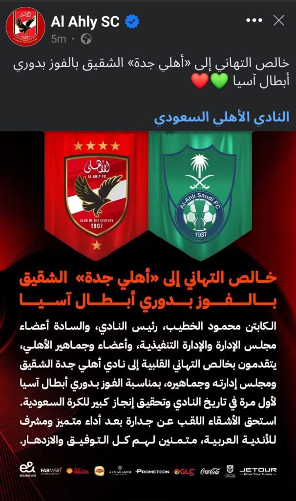 تقدم النادي الأهلي المصري بخالص التهاني إلى نادي الأهلي السعودي، بمناسبة تتويجه بلقب دوري أبطال آسيا للنخبة، عقب فوزه المستحق على فريق كاواساكي فرونتال الياباني في المباراة النهائية التي أقيمت مساء اليوم على ملعب الجوهرة المشعة في جدة.