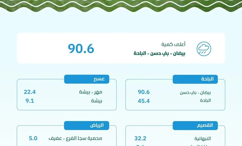 سجّلت منطقة الباحة أعلى معدل لكميات هطول الأمطار في المملكة بـ (90.6) ملم في بيضان ببني حسن، وذلك ضمن (7) مناطق شهدت كميات متفرقة من الأمطار، فيما سجّلت الباحة (45.4) ملم، وبني حسن (13.0) ملم، وشبرقة (9.4) ملم في منطقة الباحة.