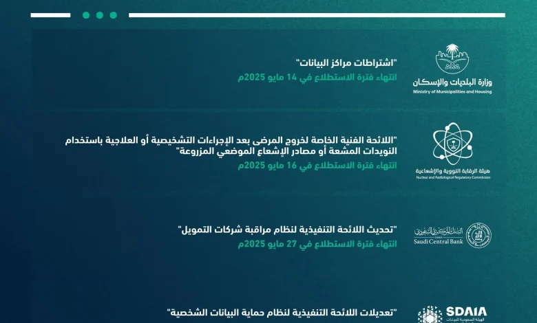 وتضمنت أبرز المشروعات المطروحة في المنصة مشروع (اشتراطات مراكز البيانات)؛ الذي تهدف منه وزارة البلديات والإسكان إلى تعزيز البنية التحتية لخدمات الاتصال والإنترنت، وتمكين خدمات الحوسبة السحابية، وتسهيل رحلة المستثمر في إصدار التراخيص البلدية لبناء وتطوير مراكز البيانات؛ وينتهي الاستطلاع على المشروع بتاريخ 14 مايو 2025.