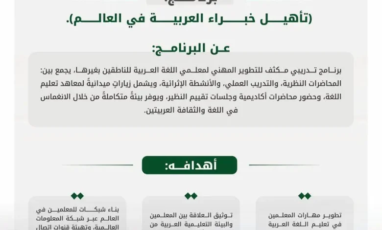 ويهدف البرنامج إلى تأهيل قيادات تعليمية في ميدان تعليم اللغة العربية للناطقين بغيرها، من خلال بناء كفاياتهم التخصصية، وتوسيع خبراتهم التعليمية، وربطهم بالممارسات المتقدمة في مؤسسات تعليم اللغة العربية داخل المملكة.