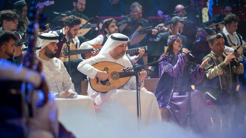 وتضمّن حفل انطلاق الملتقى عرضاً موسيقياً ضخماً قدّمته أوركسترا مكونة من 50 عازفاً من جنسيات متعددة، قدموا ساعة موسيقية ساحرة مزجت بين أنماط مختلفة مثل الفلامينكو الإسباني، والروك، والموسيقى العربية الشرقية، إلى جانب الأنماط الهندية، والأوزبكية، والأذربيجانية، والتركية، في مشهد يعكس روح التنوع والانفتاح الثقافي العالمي.