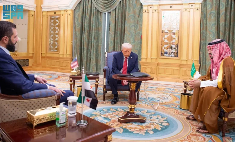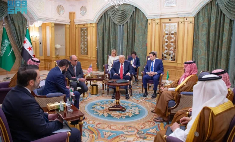 بدعوة كريمة من صاحب السمو الملكي الأمير محمد بن سلمان بن عبدالعزيز آل سعود ولي العهد رئيس مجلس الوزراء، تم عقد لقاء في (الرياض) صباح هذا اليوم الأربعاء ( 16 / 11 / 1446 هـ ) الموافق ( 14 / 5 / 2025 م ) بين سموه الكريم وفخامة رئيس الولايات المتحدة الأمريكية السيد / دونالد جي ترمب، وفخامة رئيس الجمهورية التركية السيد / رجب طيب أردوغان (مشاركًا عبر اتصال هاتفي) وفخامة رئيس الجمهورية العربية السورية السيد / أحمد الشرع، وتم تناول مستقبل الأوضاع في سوريا، وتأكيد أهمية استقرارها وسيادتها ووحدة أراضيها، وتحقيق الأمن والرخاء للشعب السوري، وكذلك بحث الأوضاع الإقليمية وأهمية العمل على إيجاد الحلول المناسبة لها.