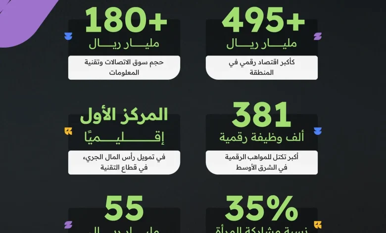 وفي تمكين القدرات البشرية الرقمية عززت المملكة ريادتها الإقليمية بصفتها أكبر تكتل للمواهب الرقمية بأكثر من (381) ألف وظيفة نوعية في القطاع التقني، وشكّل تمكين المرأة أحد أبرز ملامح هذا التحول، إذ ارتفعت نسبة مشاركتها في القطاع من (7%) عام 2018 إلى (35%) اليوم، وهي الأعلى على مستوى المنطقة، متفوقةً على متوسطات دول مجموعة العشرين والاتحاد الأوروبي.