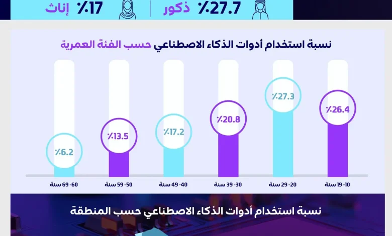 وأوضح التقرير أن الفئة العمرية بين (20) و(29) عامًا تُعد الأكثر استخدامًا لأدوات الذكاء الاصطناعي بنسبة بلغت (27.3%)، مما يعكس وعي هذه الفئة بدور التقنيات الحديثة في تحسين جودة الحياة على المستويات المهنية والتعليمية والترفيهية.