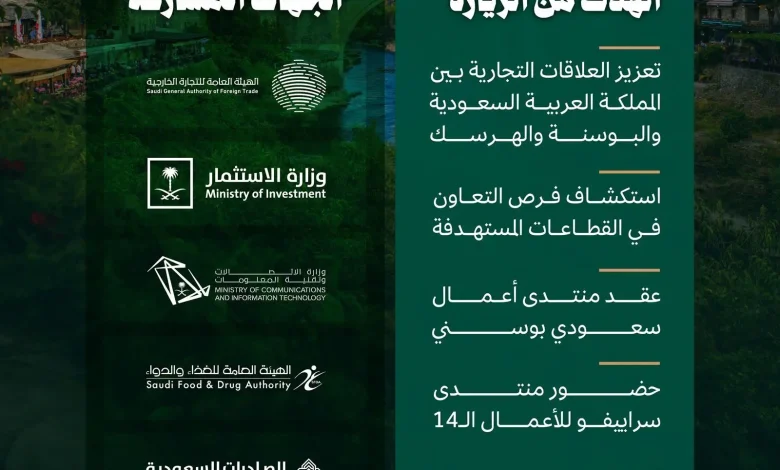 وتهدف المشاركة في المنتدى الذي يُقام في (21) مايو الجاري، إلى تعزيز العلاقات التجارية بين المملكة والبوسنة والهرسك، واستكشاف فرص التعاون في القطاعات المستهدفة، وجذب الاستثمارات الأجنبية، ورفع مستوى التواصل الحكومي للدول المشاركة، وعقد طاولة مستديرة للأعمال السعودية البوسنية، إضافة إلى توقيع اتفاقية بين القطاع الخاص من الجانبين، وزيارة شركة “بي إتش تيلكيوم” الرائدة في مجال الاتصالات، وشركة “بينجو” أكبر الأسواق المركزية البوسنية.