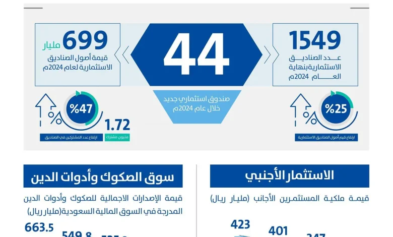كشفت هيئة السوق المالية عن تجاوز قيمة الأصول المدارة في السوق المالية السعودية للمرة الأولى حاجز التريليون ريال بنهاية عام (2024)م، محققةً نسبة نمو بلغت (20.9)% مقارنة بالعام السابق, وارتفع عدد صناديق الاستثمار إلى (1,549) صندوقًا، فيما بلغ عدد المشتركين في الصناديق العامة والخاصة أكثر من (1.72) مليون مشترك وبزيادة قدرها (47)% عن عام (2023)م.