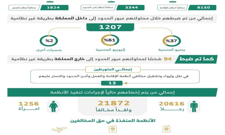 ثانيًا: بلغ إجمالي من تم ضبطهم خلال محاولتهم عبور الحدود إلى داخل المملكة (1207) أشخاص (37%) منهم يمنيو الجنسية، و(61%) إثيوبيو الجنسية، و(02%) جنسيات أخرى، كما تم ضبط (94) شخصًا لمحاولتهم عبور الحدود إلى خارج المملكة بطريقة غير نظامية.