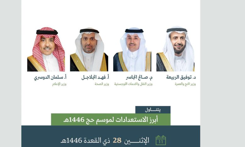 المؤتمر الصحفي الحكومي يستضيف وزير الحج والعمرة ووزير النقل والخدمات اللوجستية ووزير الصحة ووزير الإعلام للحديث عن استعدادات موسم الحج