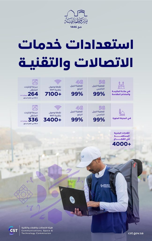 واطلع كل من السواحه والعوهلي خلال زيارة معاليهما الميدانية لعدد من مواقع مشغلي الاتصالات في مكة المكرمة والمشاعر المقدسة على استعدادات القطاع لهذا العام، حيث بين العوهلي أن التجهيزات شملت أكثر من 10500 نقطة وصول لخدمة WiFi في مكة المكرمة، والمدينة المنورة، والمشاعر المقدسة، فيما بلغت سرعة الإنترنت المتنقل في مكة المكرمة 264 ميجابت/ث، بزيادة 10% مقارنةً بالعام السابق، في حين بلغت 336 ميجابت/ث، بزيادة 19% مقارنة بالعام السابق، كذلك بلغت تغطية الجيل الخامس في مكة المكرمة, والمدينة المنورة, والمشاعر المقدسة 99%، بينما تغطية الجيل الرابع في نفس الأماكن تجاوزت 99%.