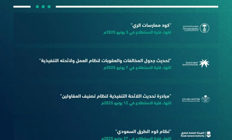 من جانبها طرحت الهيئة العامة للطرق مشروع (كود الطرق السعودي)، الذي تهدف منه تطبيق (كود), ليسهم في تطوير شبكات الطرق في المملكة وفق معايير الجودة والسلامة، وينتهي الاستطلاع على المشروع بتاريخ 27 يونيو 2025.