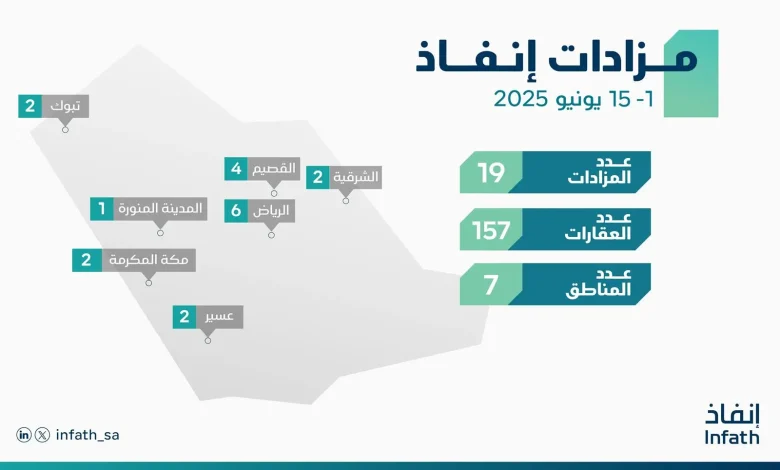 “إنفاذ” يُشرف على 19 مزادًا لبيع 157 أصلًا