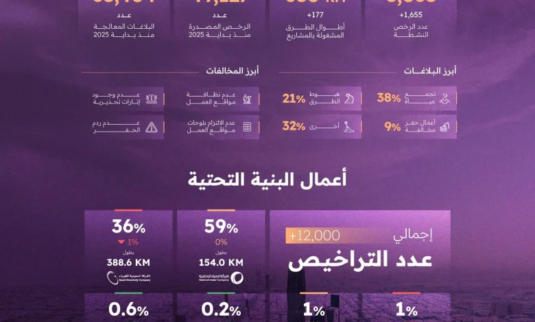 وأشار المركز إلى تسجيل أكثر من 12 ألف رخصة، وأكثر من 6 آلاف بلاغ خلال شهر أبريل تصدرتها بلاغات تجمع المياه بنسبة 38%، وهبوط الطرق بنسبة 21%، فيما تنوعت المخالفات بين عدم نظافة مواقع العمل، وعدم وجود إنارة تحذيرية وحواجز مؤقتة، إلى جانب عدم ردم الحفر في أعمال المشاريع.