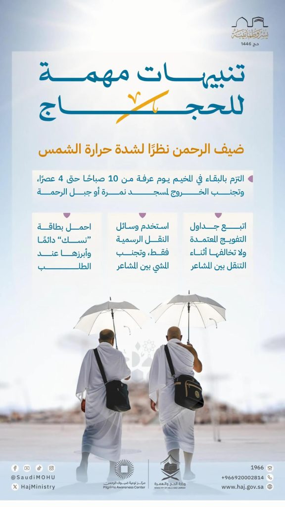 كثّفت وزارة الحج والعمرة جهودها وجاهزية خدماتها المقدمة لضيوف الرحمن في موسم حج هذا العام 1446هـ، ليؤدوا مناسكهم بكل راحة وسكينة، وفي إطار الحفاظ على سلامة الحجاج مع ارتفاع درجات الحرارة في المشاعر المقدسة، دعت الوزارة حجاج بيت الله الحرام، للالتزام بالبقاء في المخيمات يوم عرفة من الساعة “10 صباحًا” وحتى “4 عصرًا”، وعدم الخروج إلى جبل الرحمة أو مسجد نمرة، وذلك حفاظًا على سلامتهم من التعرض لأشعة الشمس ودرجات الحرارة المرتفعة.