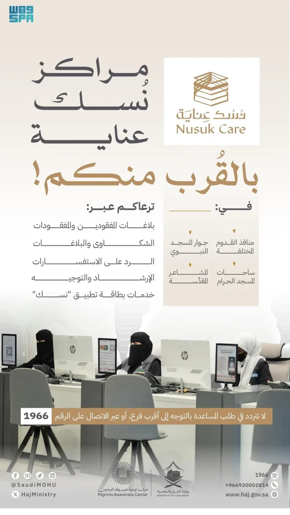 وتُعد “نُسك عناية” منظومة خدمية متكاملة أطلقتها وزارة الحج والعمرة عام 2019، تهدف إلى الارتقاء بتجربة ضيوف الرحمن من خلال تقديم خدمات إنسانية وإرشادية وصحية لحظة بلحظة، عبر فرق ميدانية مؤهلة وموزعة في المواقع الحيوية، وتُعد هذه المراكز نقطة الاتصال الأولى مع الحجاج، وتستقبل البلاغات والاستفسارات، وتوفّر حلولًا فورية لمختلف التحديات التي قد تواجههم.