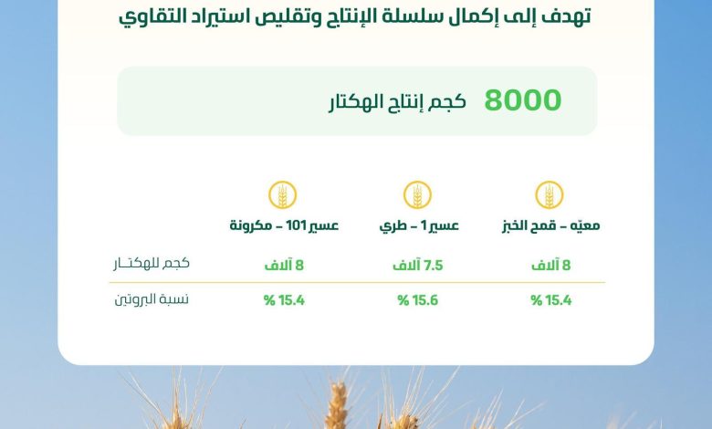 يُذكر أن مشروع زراعة أصناف القمح المحلي المطورة، يأتي ضمن خطة مركز البذور والتقاوي؛ لتحسين الأصناف المحلية للقمح، ضمن مستهدفات الإستراتيجية الوطنية للزراعة؛ لعكس التزام الوزارة بتعزيز استدامة القطاع الزراعي، ورفع كفاءة الإنتاج المحلي، وفق مستهدفات رؤية المملكة 2030.