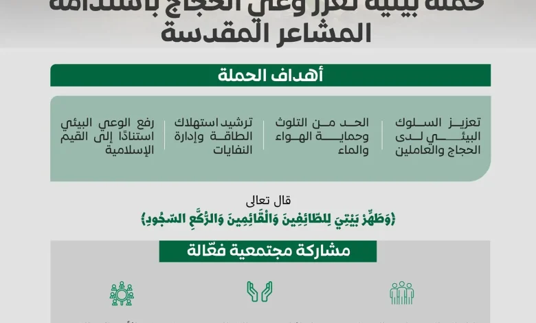 وتركز الحملة على رفع الوعي بأهمية إدارة الموارد بكفاءة، والحد من النفايات، وترشيد استهلاك الطاقة والمياه، بما يسهم في تحسين جودة الهواء وتعزيز الاستدامة البيئية في المشاعر.