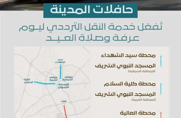 وتشمل الخدمة ثلاثة مسارات رئيسية: من محطة سيد الشهداء إلى المسجد النبوي الشريف، ومن محطة كلية السلام إلى المسجد النبوي الشريف، ومن محطة العالية إلى مسجد قباء, وسيتم تشغيل الخدمة في يوم عرفة حتى بعد صلاة العشاء بساعة، بينما تستمر يوم العيد حتى بعد صلاة العيد بساعة.