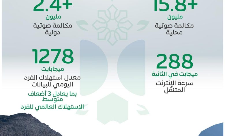 وفيما يتعلق بمؤشرات الإنترنت المتنقل أظهرت الإحصاءات أن وسيط سرعة الإنترنت المتنقل بلغت (288) ميجابت/ثانية، بزيادة (15%) عن نفس اليوم في العام الماضي، فيما بلغ معدل استهلاك الفرد اليومي للبيانات (1278) ميجابايت، متجاوزا (29) معدل الاستهلاك العالمي.