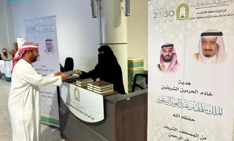 وزع فرع وزارة الشؤون الإسلامية والدعوة والإرشاد بمنطقة مكة المكرمة، ممثلًا بمكتب أعمال الوزارة بمطار الطائف الدولي، هدية خادم الحرمين الشريفين الملك سلمان بن عبدالعزيز آل سعود -حفظه الله- من المصحف الشريف على حجاج بيت الله الحرام المغادرين عبر المطار، بعد أن أتموا مناسك الحج لهذا العام 1446هـ.
