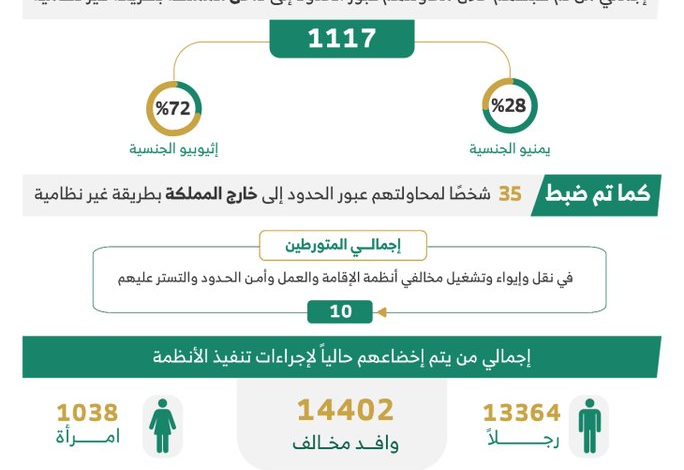 ثانيًا: بلغ إجمالي من تم ضبطهم خلال محاولتهم عبور الحدود إلى داخل المملكة (1117) شخصًا (28%) منهم يمنيو الجنسية، و(72%) إثيوبيو الجنسية، كما تم ضبط (35) شخصًا لمحاولتهم عبور الحدود إلى خارج المملكة بطريقة غير نظامية.