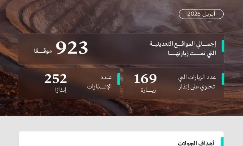 نفذت وزارة الصناعة والثروة المعدنية -ممثلة بوكالة الإشراف على العمليات التعدينية- (923) جولة رقابية، على عددٍ من المواقع التعدينية في مختلف مناطق المملكة خلال شهر أبريل الماضي، ووجّهت (252) إنذارًا للمواقع التعدينية المخالفة لنظام الاستثمار التعديني، وذلك تطبيقًا لمبدأ الإنذار قبل إقرار المخالفة.