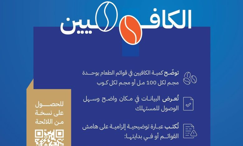 ويمكن للمنشآت الغذائية مثل المطاعم والمقاهي وللمستهلكين الاستفادة من “حاسبة الكافيين الإلكترونية” عبر موقع الهيئة، لحساب كمية الكافيين في المشروبات بسهولة من خلال الرابط: https://www.sfda.gov.sa/ar/body-calculators/caffeine-calculator, وللحصول على نسخة من اللوائح الفنية المعتمدة التي تشمل وسم الوجبات الغذائية عالية المحتوى بالملح والإفصاح عن محتوى الكافيين ووسم النشاط البدني يمكن زيارة المتجر الإلكتروني “مواصفة” عبر الرابط: https://mwasfah.sfda.gov.sa/Home, وللاستفسارات الفنية التواصل مع الهيئة عبر الرقم الموحد 19999.
