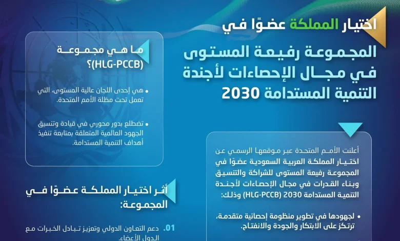 أعلنت الأمم المتحدة عن اختيار المملكة العربية السعودية ممثلةً بالهيئة العامة للإحصاء عضوًا في المجموعة رفيعة المستوى للشراكة والتنسيق وبناء القدرات في مجال الإحصاءات لأجندة التنمية المستدامة 2030 (HLG-PCCB).