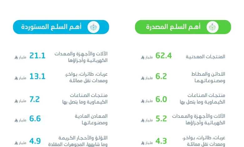 وأفادت نتائج النشرة أن “منتجات الصناعات الكيماوية” من أهم سلع الصادرات غير البترولية، وبلغت (6.0) مليارات ريال وشكلت (26.4%) من إجمالي الصادرات غير البترولية، في حين كانت أكبر السلع المستوردة “الآلات والأجهزة والمعدات الكهربائية وأجزاؤها” التي سجلت ما قيمته (21.1) مليار ريال وتشكل (26.0%) من إجمالي الواردات.