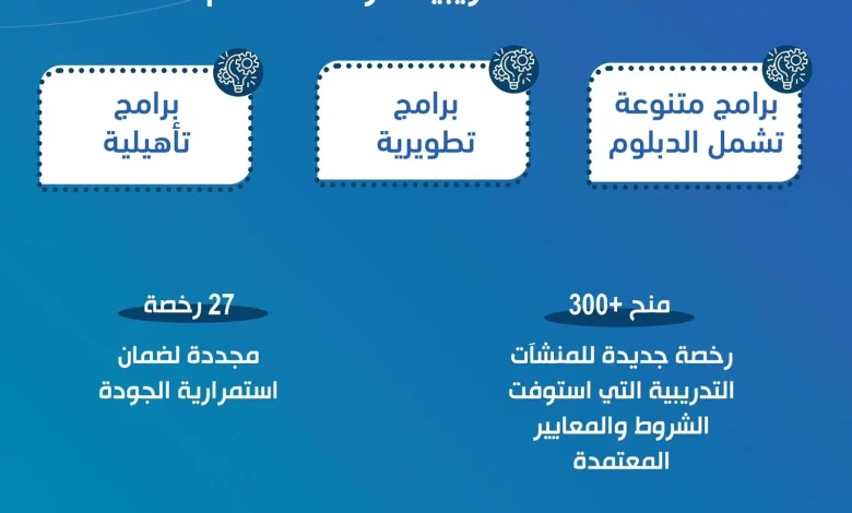 وأوضح المتحدث الرسمي للمؤسسة فهد العتيبي أن المؤسسة منحت خلال العام الماضي (339) رخصة جديدة لمنشآت تدريبية أهلية بعد استيفائها لجميع الاشتراطات والمعايير المعتمدة من قبل الإدارة العامة للتدريب الأهلي بالمؤسسة، إضافة إلى تجديد (27) رخصة لمنشآت تدريبية قائمة.