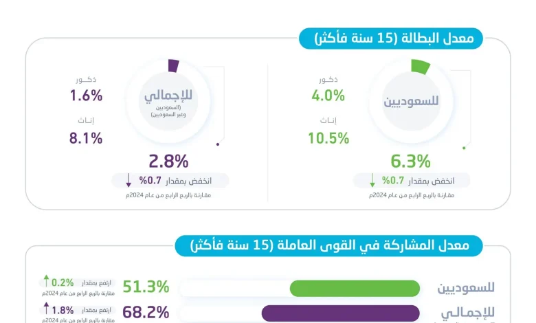 كشفت الهيئة العامة للإحصاء أن معدل البطالة الإجمالي (للسعوديين وغير السعوديين) بلغ (2.8%)، وبلغ معدل المشاركة في القوى العاملة الإجمالي (للسعوديين وغير السعوديين) (68.2%)، وسجل معدل مشاركة السعوديين في القوى العاملة ارتفاعًا بلغ (51.3%) مقارنة بالربع الرابع من عام (2024م).