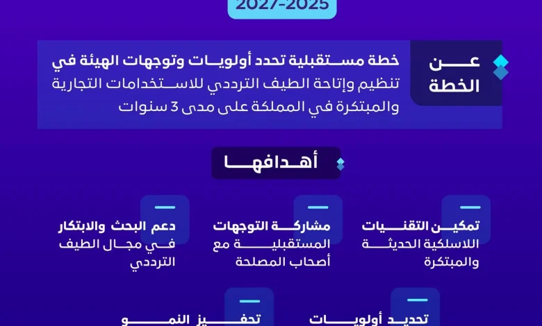 أعلنت هيئة الاتصالات والفضاء والتقنية عن إطلاق خطتها للاستخدام التجاري والمبتكر للطيف الترددي (2025–2027).
