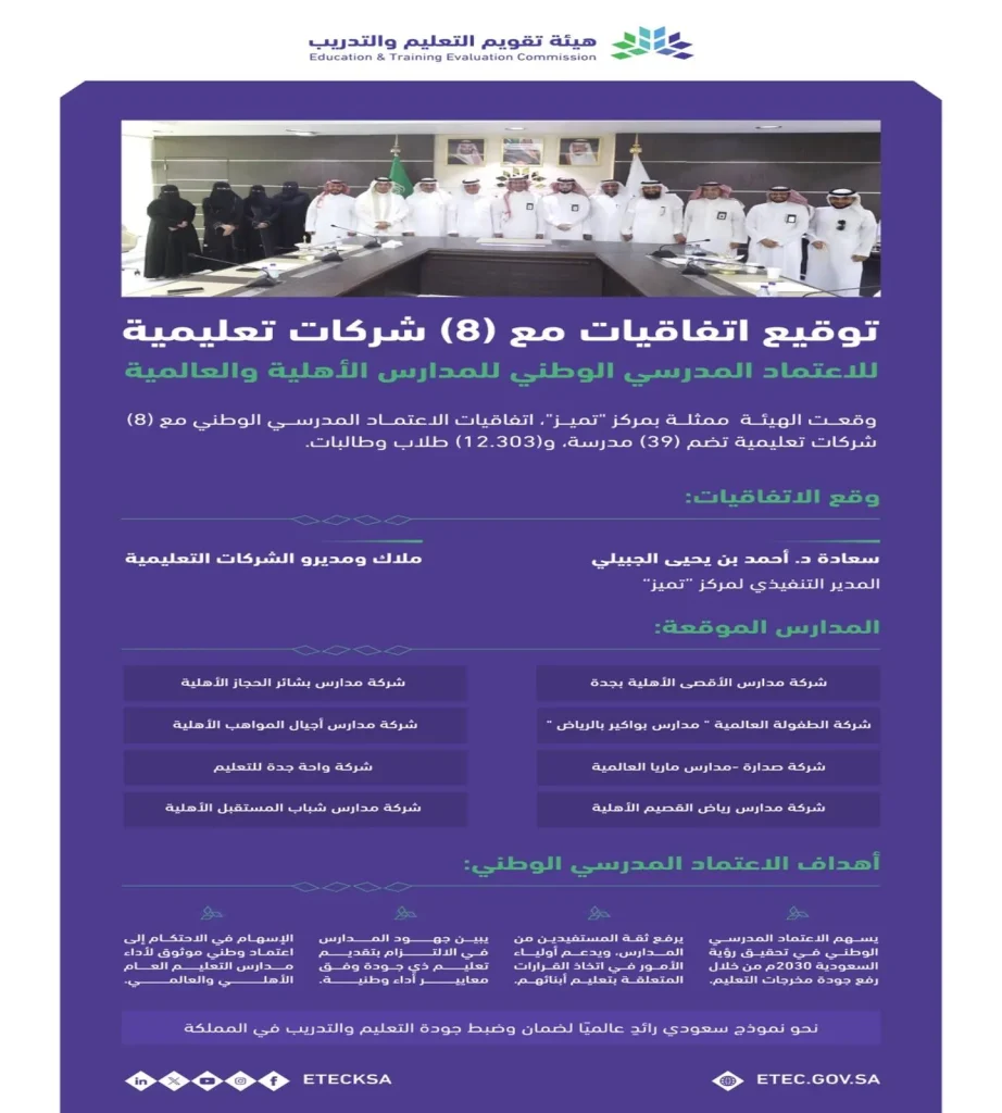 وقعت هيئة تقويم التعليم والتدريب ممثلة بالمركز الوطني للتقويم والتميز المدرسي (تميز)، اتفاقيات الاعتماد المدرسي الوطني مع (8) شركات تعليمية، تضم (39) مدرسة أهلية وعالمية، و(12303) طلاب وطالبات، وذلك في مقر الهيئة بمدينة الرياض.