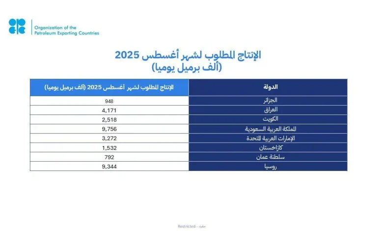 وفي ضوء الآفاق المستقبلية المستقرة للاقتصاد العالمي وأسس السوق الإيجابية الحالية، كما يتضح من انخفاض المخزونات البترولية، وبناءً على ما تم الاتفاق عليه في اجتماع 5 ديسمبر 2024م بشأن الاستعادة التدريجية والمرنة لتعديلات الإنتاج التطوعية البالغة (2.2) مليون برميل يوميًا اعتبارًا من 1 أبريل 2025م، قررت الدول المشاركة تنفيذ تعديل في الإنتاج قدره (548) ألف برميل يوميًا في شهر أغسطس 2025م مقارنة بمستوى الإنتاج المطلوب في يوليو 2025م، وهو ما يعادل أربع زيادات شهرية، كما هو موضح في الجدول المرفق، حيث إن هذه الزيادات قابلة للتعديل أو الإيقاف المؤقت، حسب متغيرات السوق، مما يمنح المجموعة المرونة اللازمة لدعم استقرار السوق، كما نوهت الدول الثماني الأعضاء في مجموعة أوبك+ أن هذا الإجراء سيوفر فرصة للدول المشاركة لتسريع جهود التعويض.