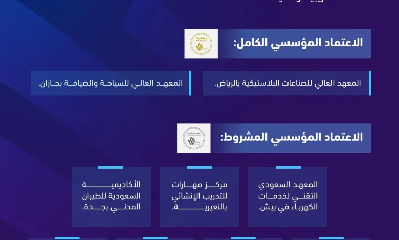 أعلنت هيئة تقويم التعليم والتدريب ممثلة في المركز الوطني لتقويم واعتماد التدريب (مسار)، عن منح الاعتماد المؤسسي لـ(9) منشآت تدريبية وطنية، بعد استيفائها متطلبات ومعايير الاعتماد المؤسسي المعتمدة من الهيئة.